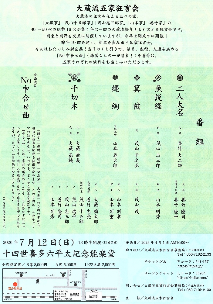 2026年7月12日(日)13:30開演十四世喜多六平太記念能楽堂チケット取扱チケットピアhttps://t.pia.jp/pia/event/event.do?eventCd=2610184ローソンチケット問合せ大蔵流五家狂言会事務局050-7102-2133
