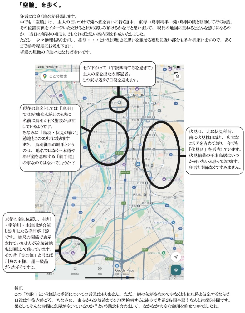10月4日ももやそ秋の会で上演した狂言「空腕」当日は、案内図をロビーに展示しました。ご希望の方には縮小版を配布…でしたが、予定枚数以上の人気となり、受け取る事ができなかった方、申し訳ございませんでした。PDFと画像をアップします。歴史に想いを馳せながらお楽しみください。