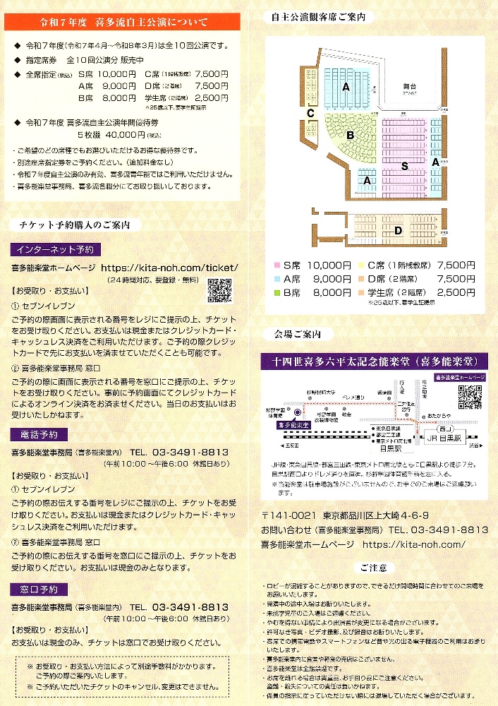 令和7年11月23日(日)13:00開演十四世喜多六平太記念能楽堂チケット予約購入のご案内インターネット予約https://kita-noh.com/ticket/電話予約/窓口予約喜多能楽堂事務局03-3491-8813