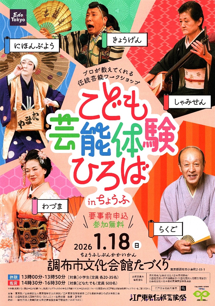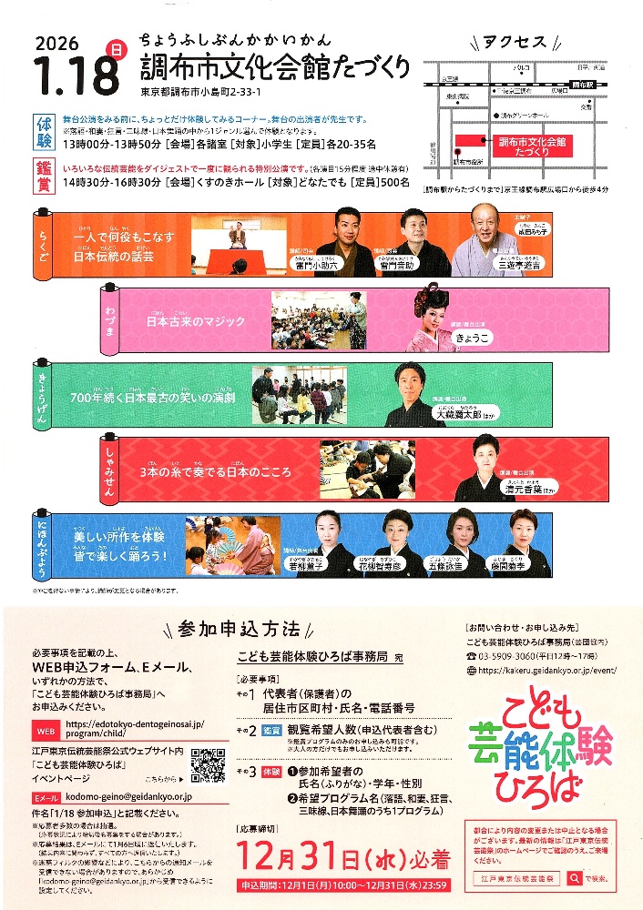 in ちょうふ2026/1/18調布市文化会館たづくり*要 事前申込*参加無料体験 13:00-13:50[対象]小学生鑑賞 14:30-16:30[対象]どなたでもお問合せ・お申込みこども芸能体験ひろば事務局03-5909-3060https://kakeru.geidankyo.or.jp/event/91/